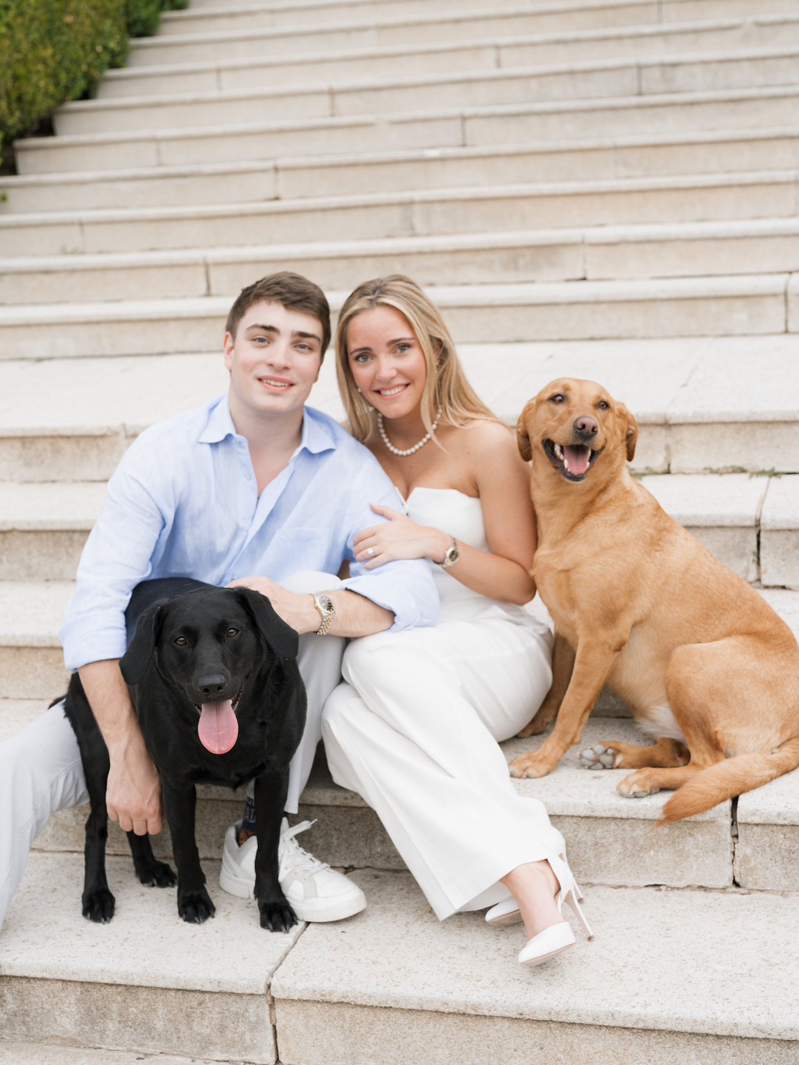 With its European-inspired architecture, lush gardens, and soft golden light, Commodore Perry Estate gave us endless inspiration. From the moment Dani stepped onto the estate grounds in her classic white dress to their quiet moments tucked beneath the arches, every frame felt like a peek into their wedding day to come. Their two pups, Koda and Lady, even made a cameo — because no session is complete without the whole family.